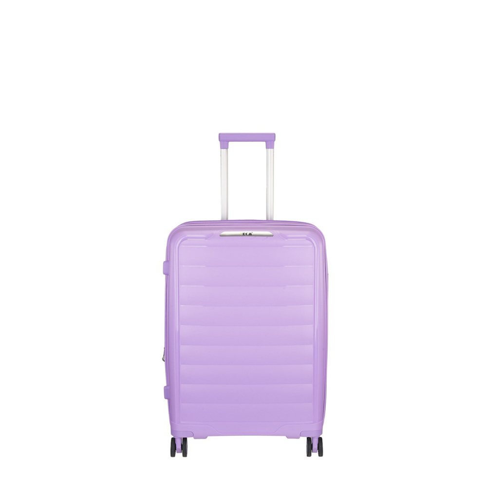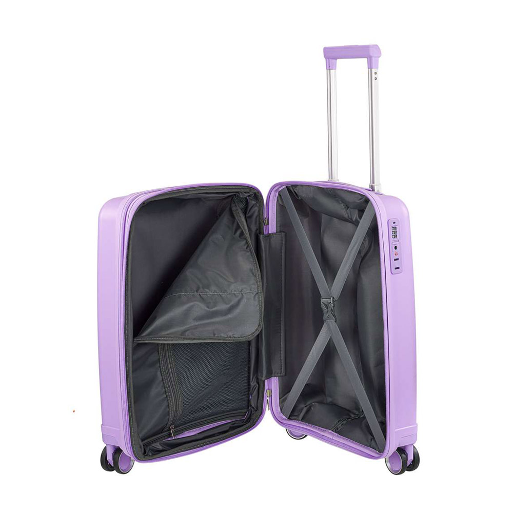 Βαλίτσα σκληρή, μικρή, καμπίνας, λιλά, με τέσσερις ρόδες της RCM. Είναι κατασκευασμένη από υλικό εξαιρετικής ποιότητας και αντοχής, μηχανισμό από αλουμίνιο, ρόδες ιδιαίτερα ευέλικτες. Κλειδώνει στην δεξιά πλευρά με κλειδαριά συνδυασμού με το σύστημα TSA και συνοδεύεται από εγγύηση αντιπροσωπείας δύο ετών.
