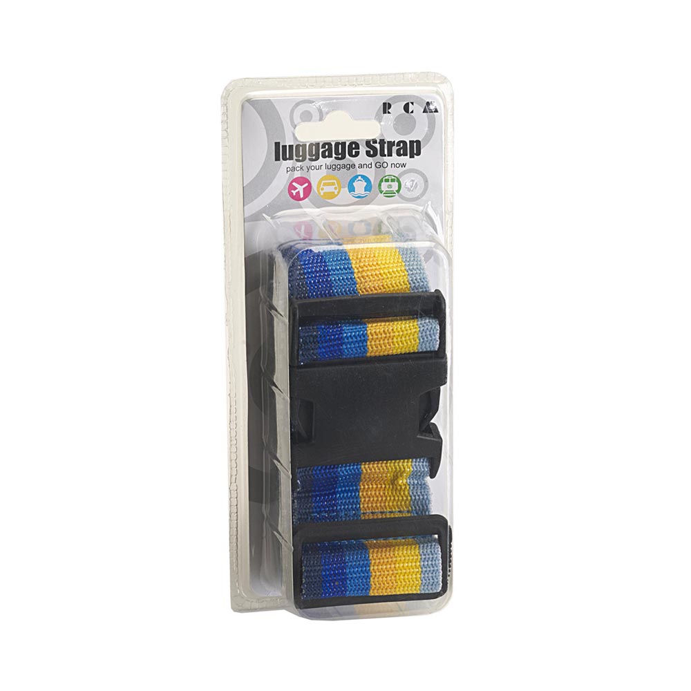 Συνθετικός, αυξομειούμενος ριγέ ιμάντας ασφάλισης των αποσκευών από την RCM σε χρώματα μπλε - κίτρινο. Ιδιαίτερα ανθεκτικός και ευέλικτος ιδανικός για κάθε περίπτωση.