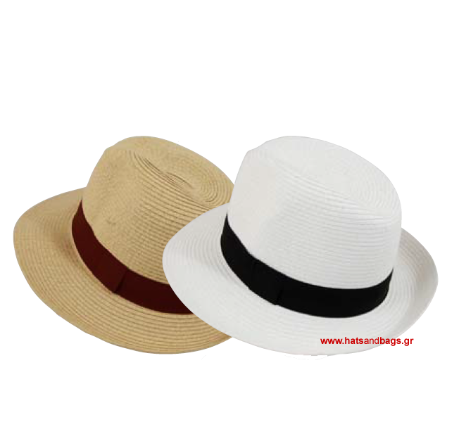 Καπέλο ψάθινο, ανδρικό, καλοκαιρινό με μεγάλο γείσο, διακοσμημένο με γκρο κορδέλα. Διαθέσιμο σε δύο χρώματα, λευκό με μαύρη κορδέλα και φυσικό με σκούρα καφέ κορδέλα.