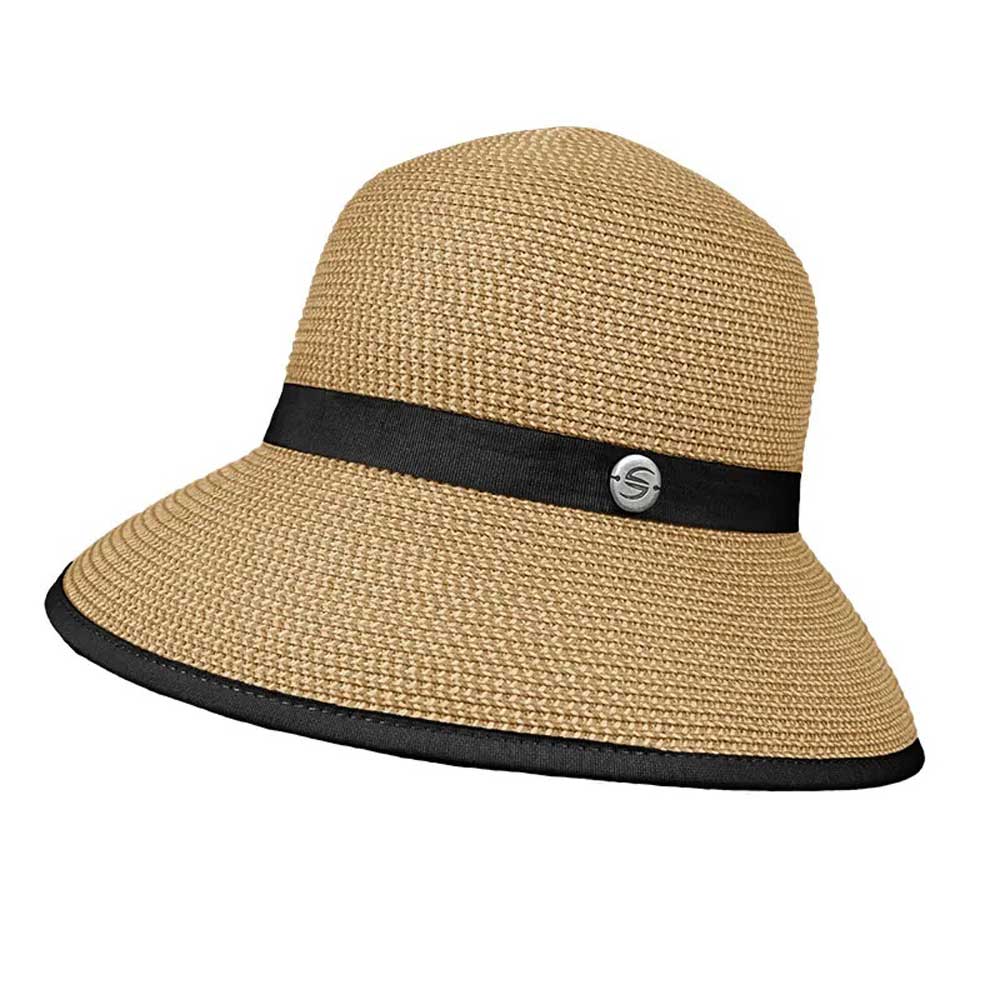 Καπέλο γυναικείο ψάθινο καλοκαιρινό με μεσαίο γείσο και μαύρες λεπτομέρειες. Το μέγεθος του ρυθμίζεται με velcro στο πίσω μέρος.