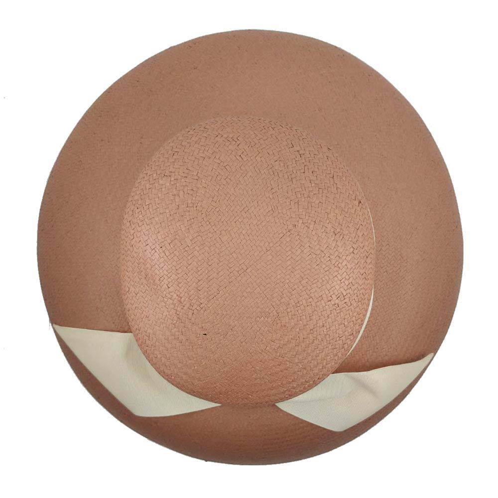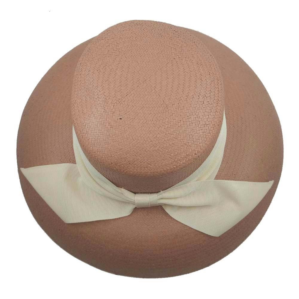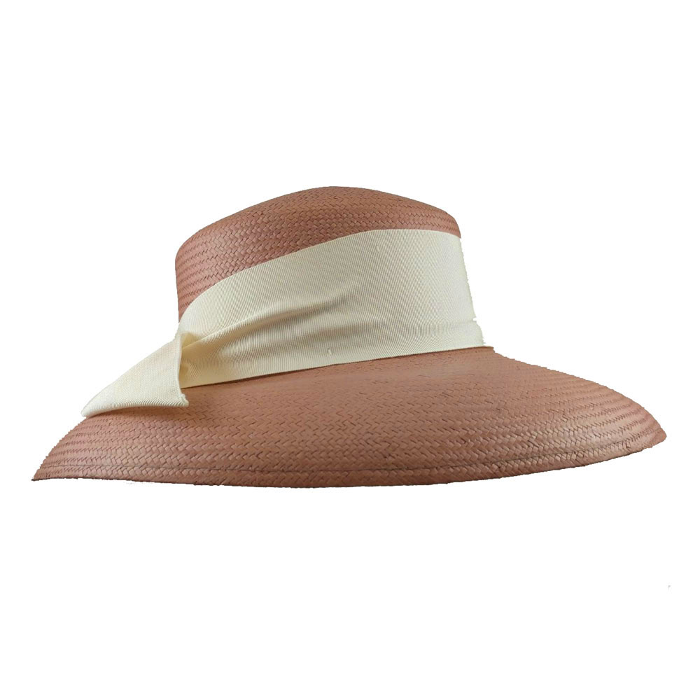 Καπέλο ψάθινο σε ροζ χρώμα  με μεγάλο γείσο και διακοσμημένο με φαρδιά εκρού κορδέλα δεμένη φιόγκο στο πίσω μέρος.