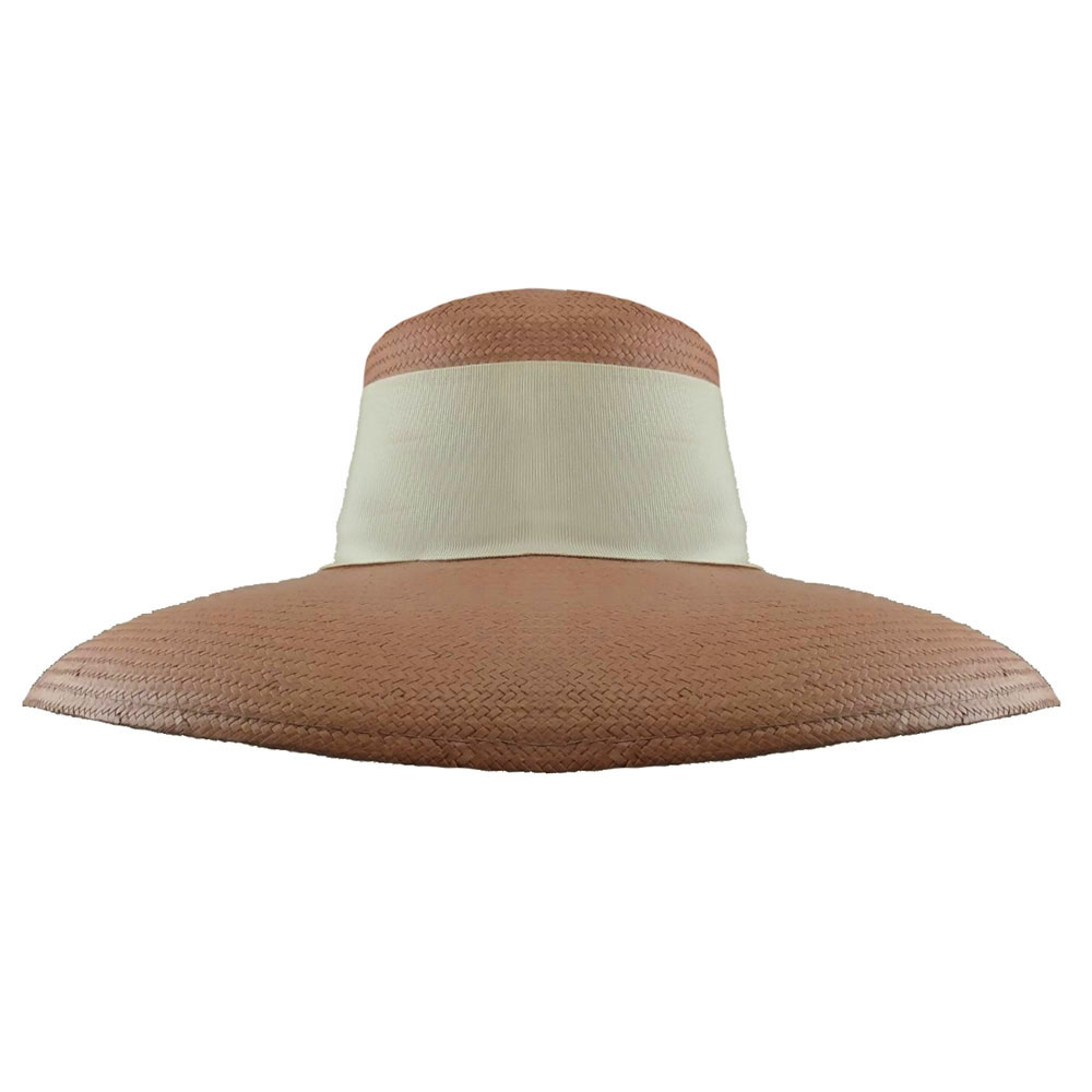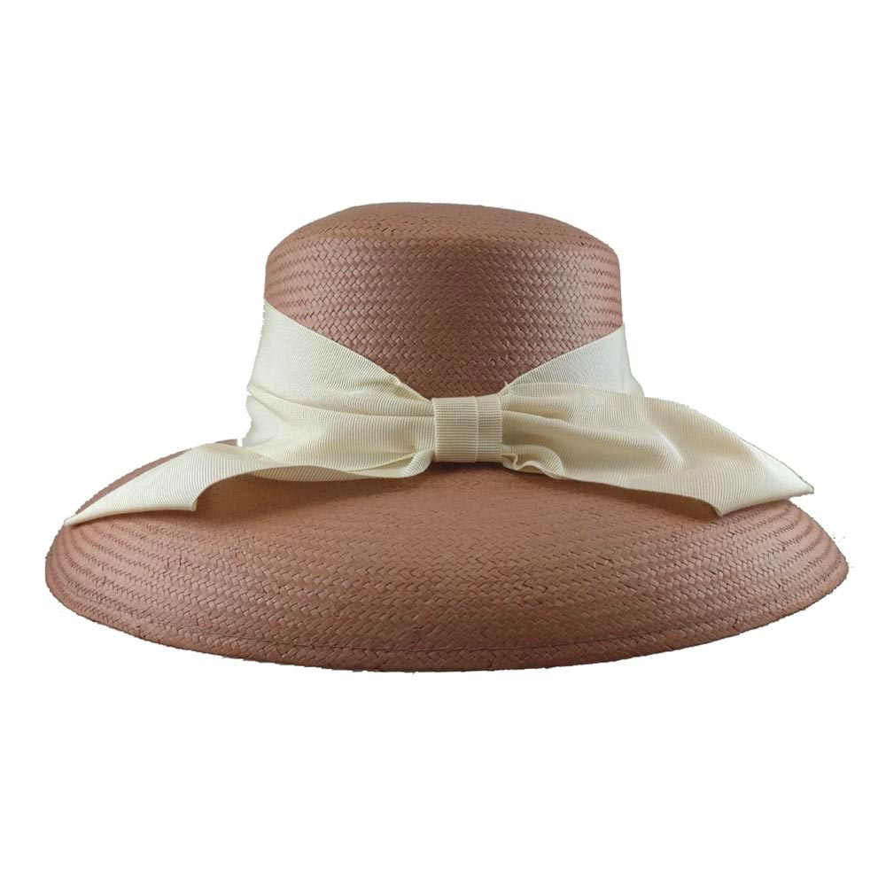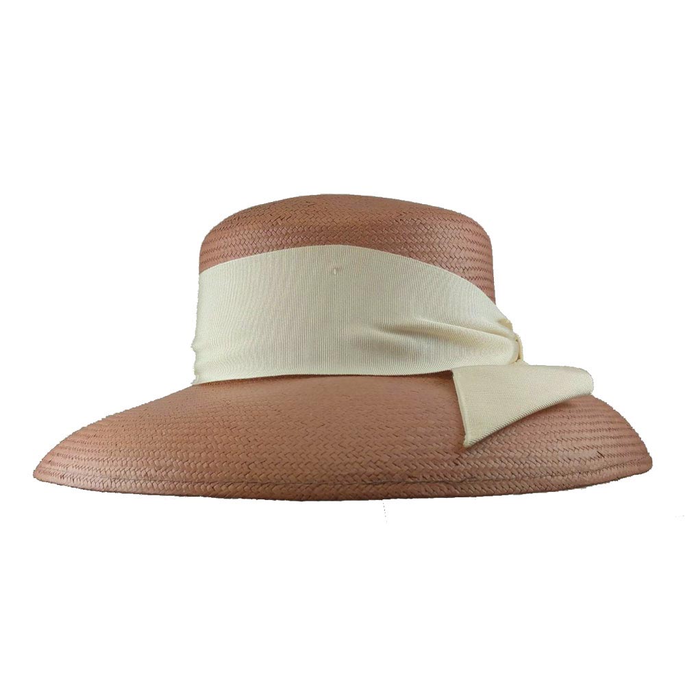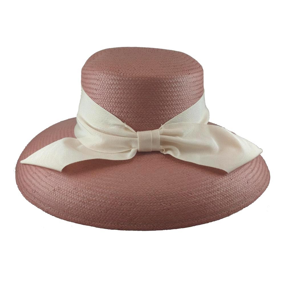 Καπέλο ψάθινο σε ροζ χρώμα  με μεγάλο γείσο και διακοσμημένο με φαρδιά εκρού κορδέλα δεμένη φιόγκο στο πίσω μέρος.