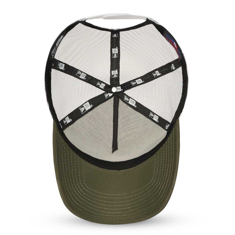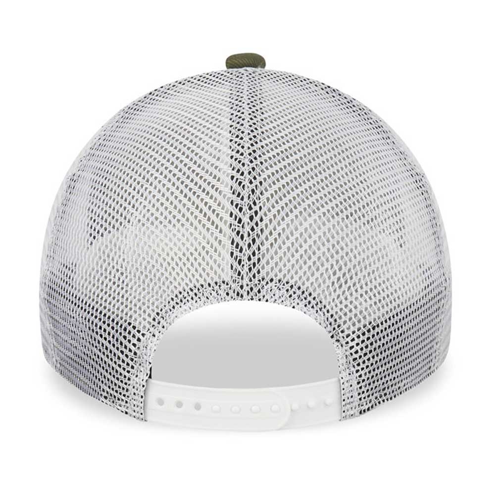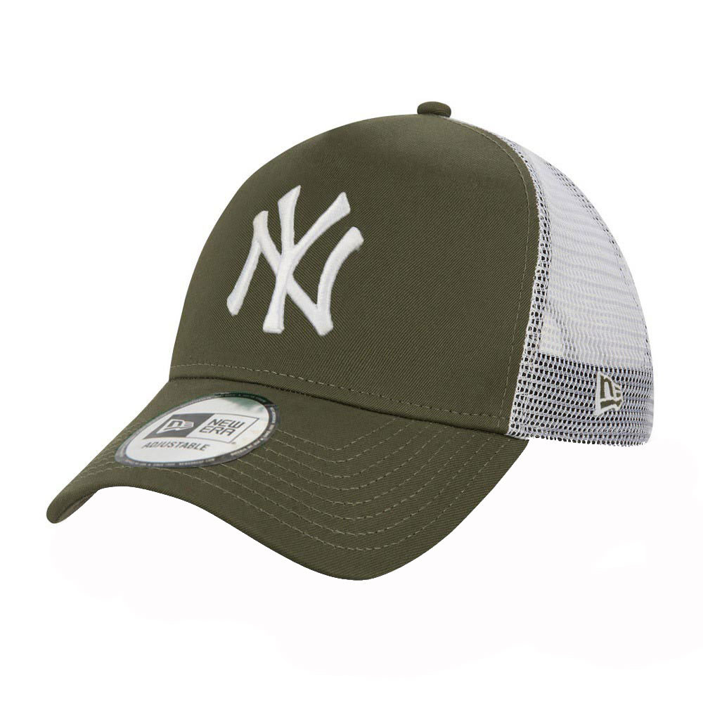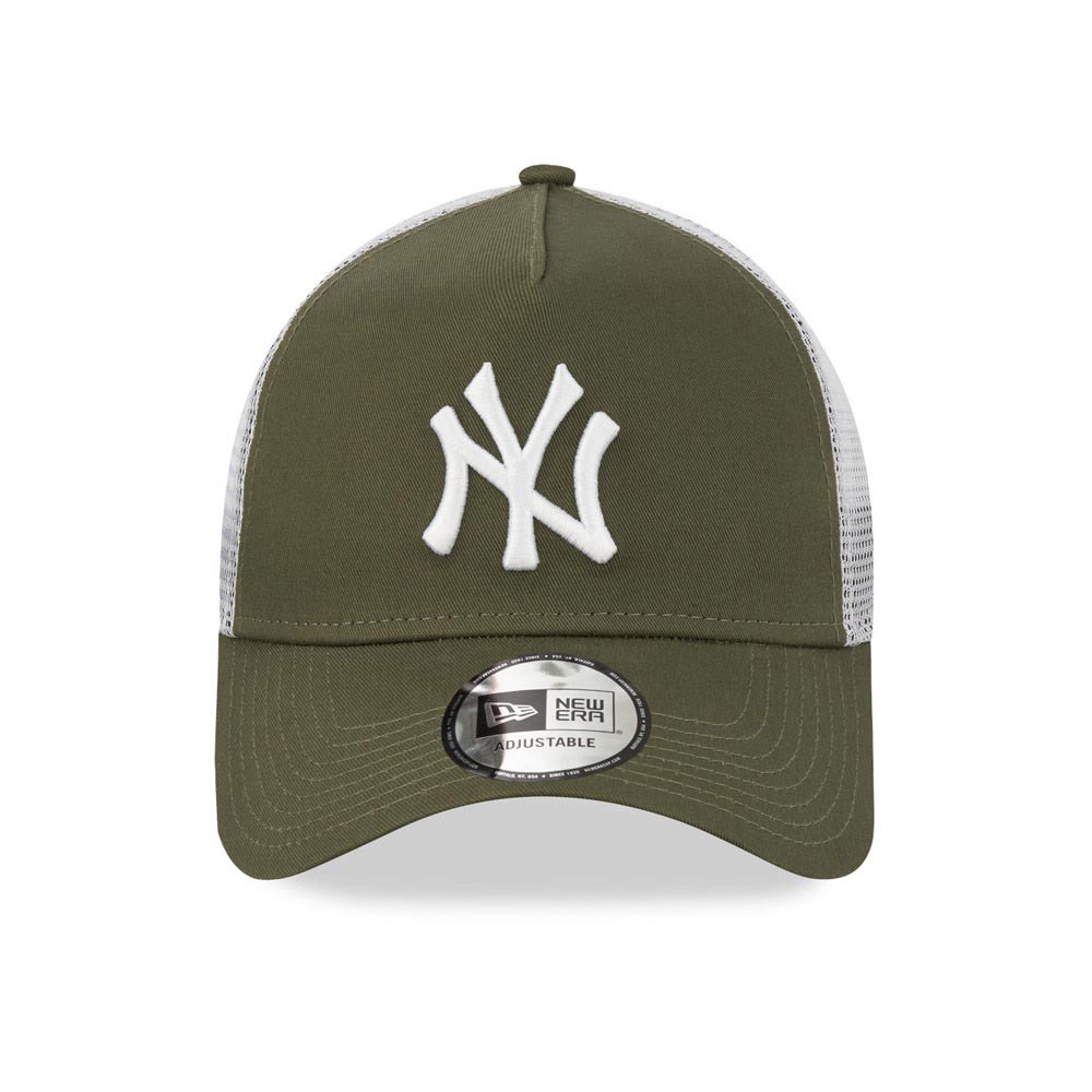 Καπέλο τζόκεϊ trucker, καλοκαιρινό, New York Yankees, ρυθμιζόμενο, κατασκευασμένο από βαμβακερό χακί ύφασμα το μπροστινό μέρος, με λευκό κέντημα το logo των NY Yankees και διάτρητο πολυεστερικό υλικό σε λευκό χρώμα το πίσω μέρος.