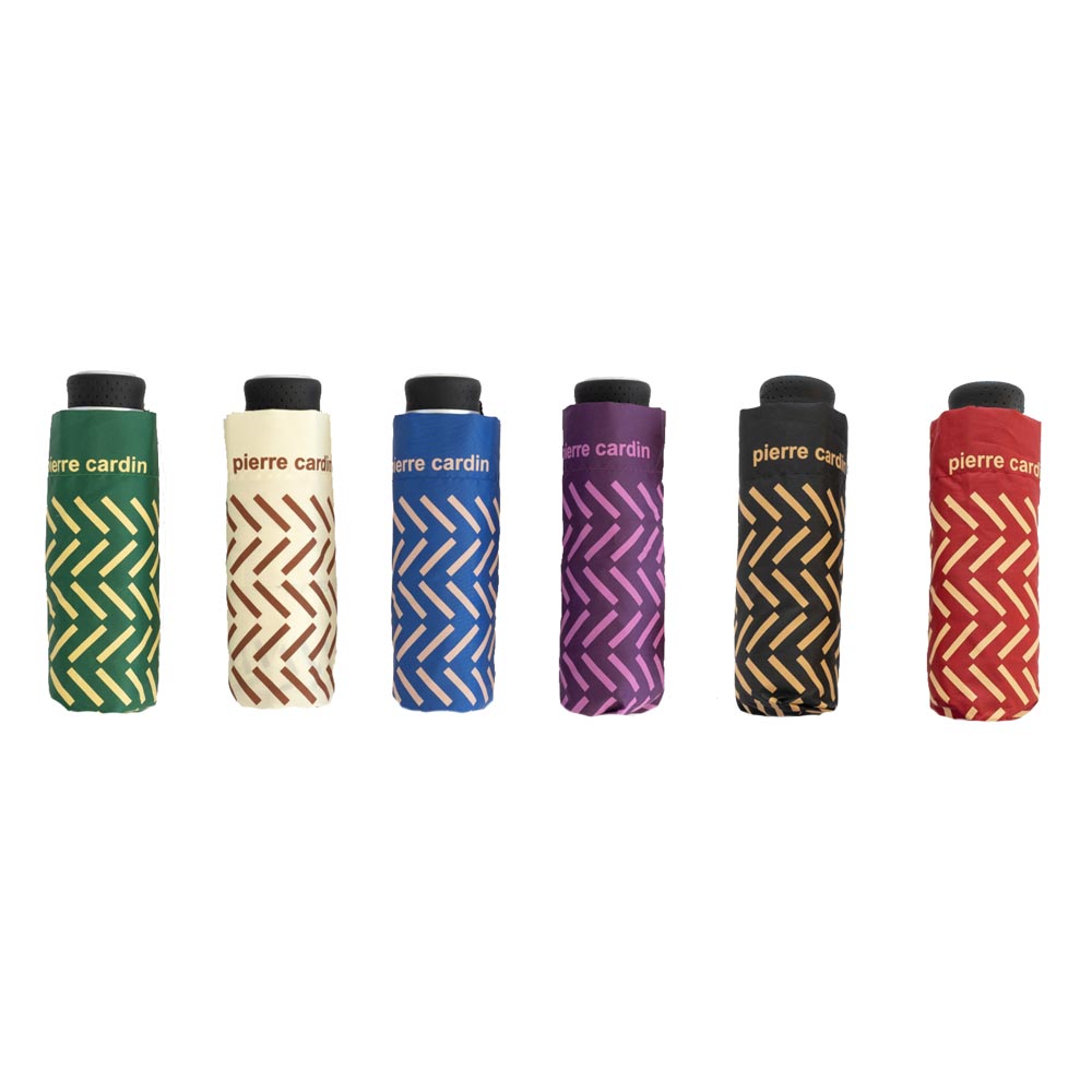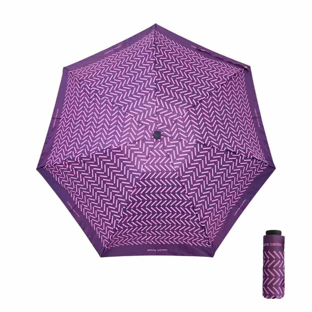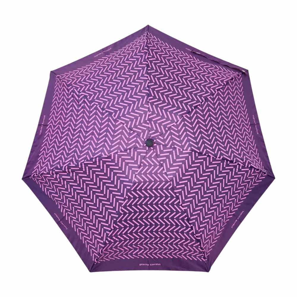 Ομπρέλα mini σπαστή γυναικεία, χειροκίνητη, αντιανεμική από τον Pierre Cardin, με γεωμετρικό μοτίβο σε μωβ φόντο. Μία φινετσάτη ομπρέλα αντιπροσωπευτική του ύφους της εταιρίας που σίγουρα δεν περνάει απαρατήρητη.