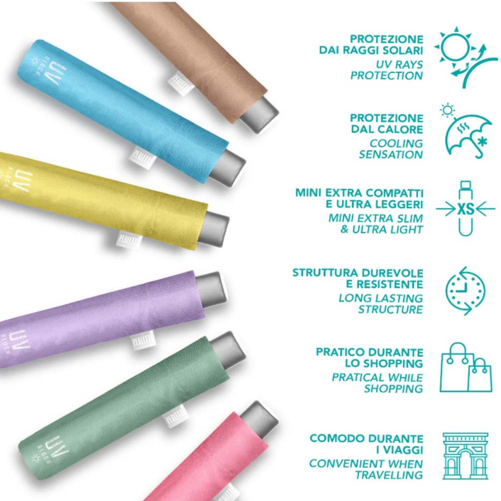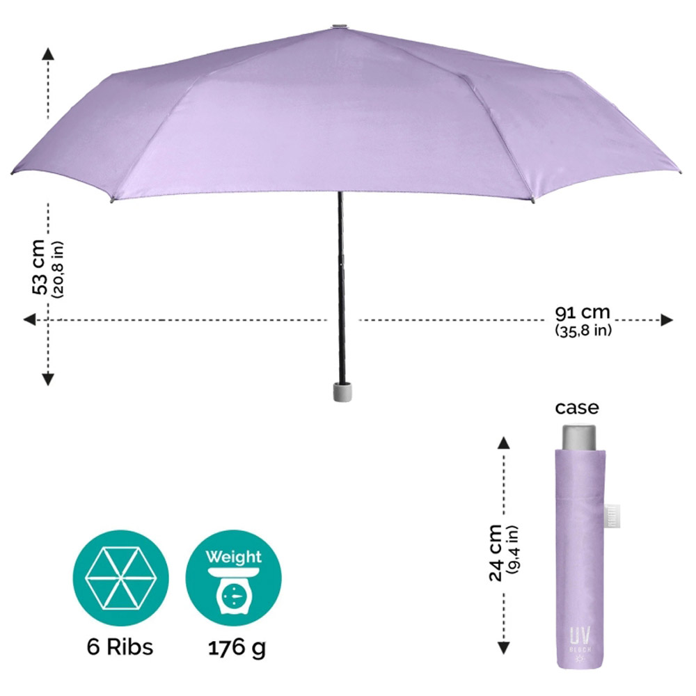 Ομπρέλα, γυναικεία, αντηλιακή, αντιανεμική, μονόχρωμη λιλά, από την Perletti. Μια ομπρέλα ιδιαίτερα ελαφριά και λεπτή, με ύφασμα που στεγνώνει εξαιρετικά γρήγορα κατασκευασμένη από υλικά φιλικά στο περιβάλλον.