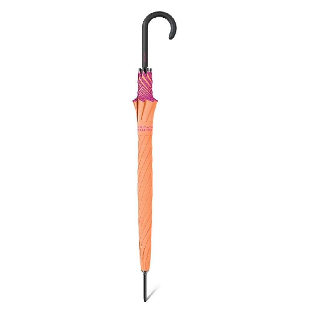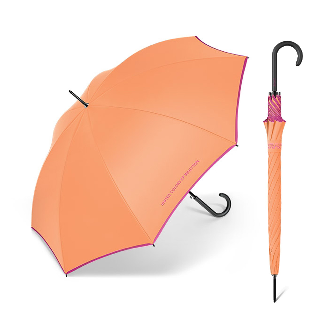 Ομπρέλα μεγάλη, αυτόματη, αντιανεμική, πορτοκαλί με φούξια ρέλι από την Benetton, με το γνωστό ύφος και στιλ της εταιρίας.