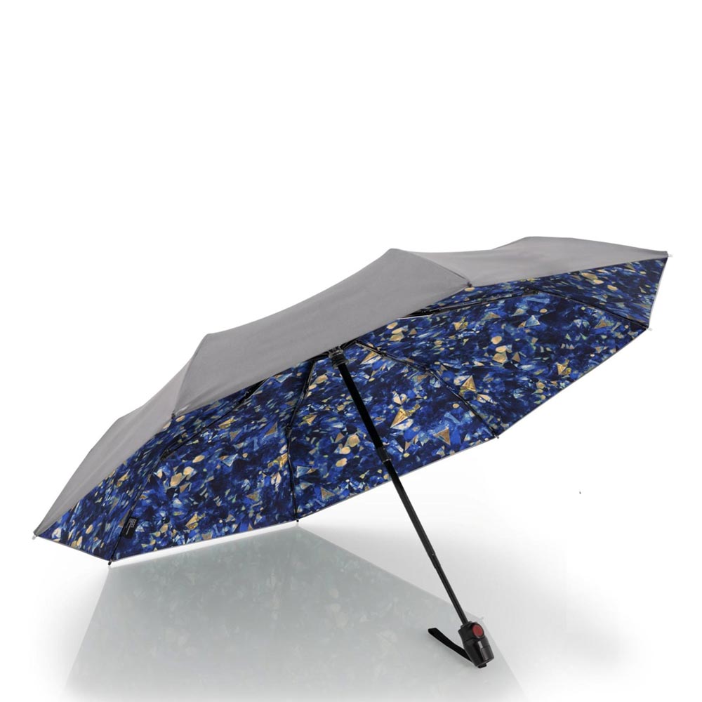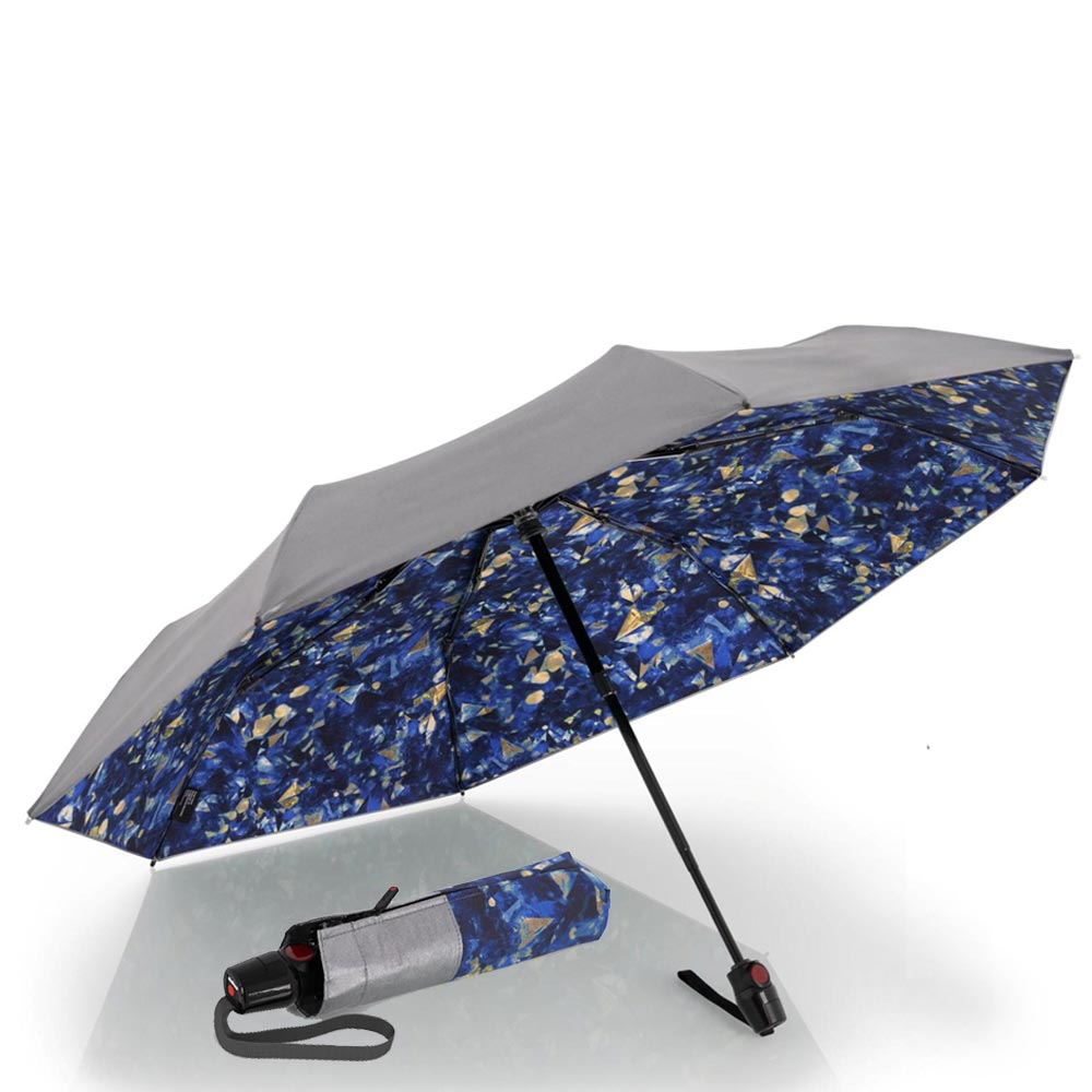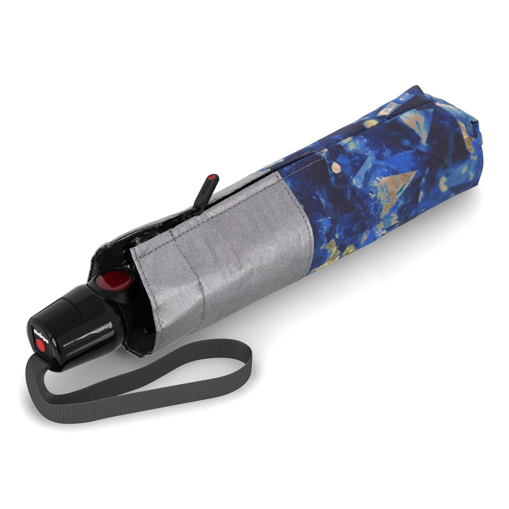 Ομπρέλα γυναικεία σπαστή με αυτόματο άνοιγμα-κλείσιμο, με 99% αντηλιακή προστασία και μείωση της θερμοκρασίας κατά 40%, σε αποχρώσεις ασημί - μπλε από την Knirps. Αποτελείται από σκελετό ιδιαίτερα ανθεκτικό και ευέλικτο ώστε να μπορεί ανταποκριθεί και στις πιο δύσκολες καιρικές συνθήκες καθώς και ύφασμα εξαιρετικής αντοχής που στεγνώνει εξαιρετικά γρήγορα.
