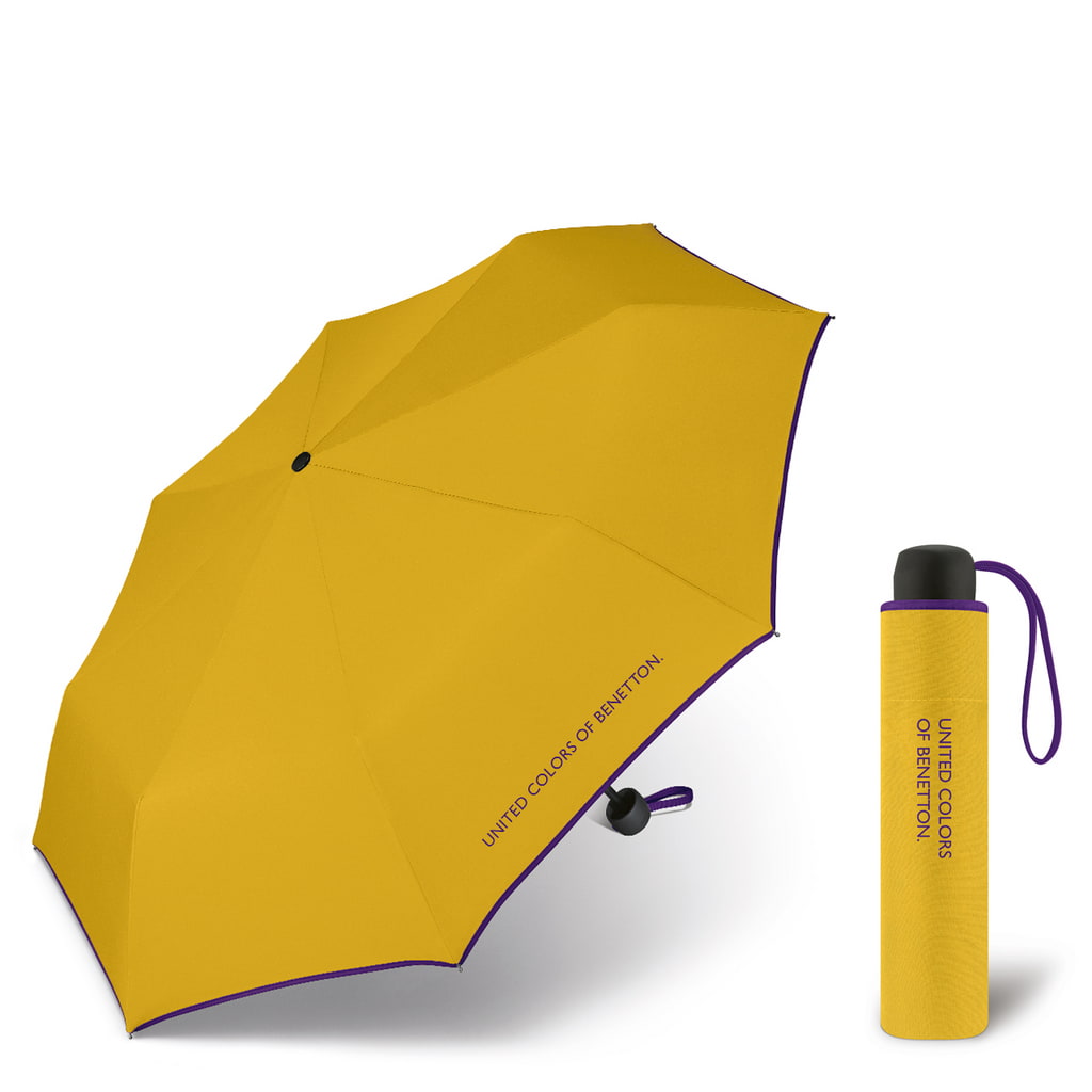 Ομπρέλα σπαστή, μονόχρωμη, κίτρινη από την Benetton, με το γνωστό ύφος και στιλ της εταιρίας.