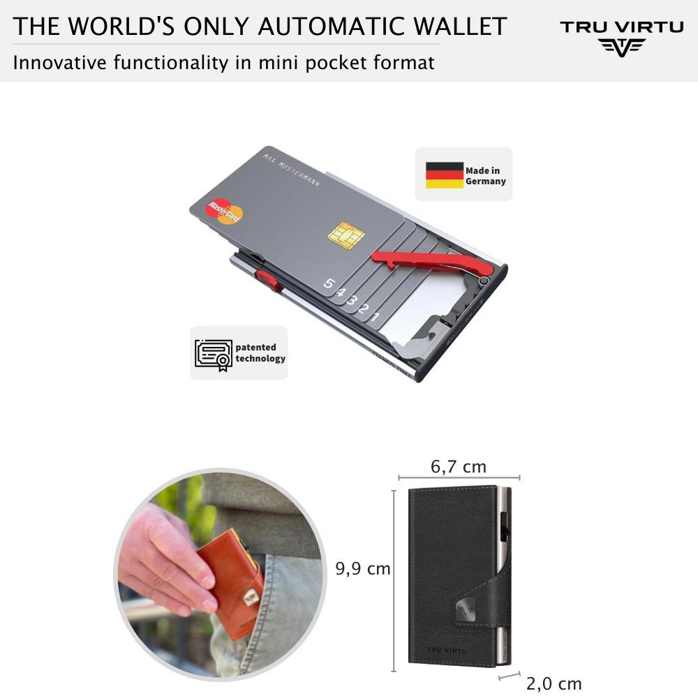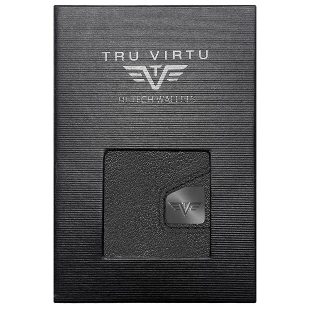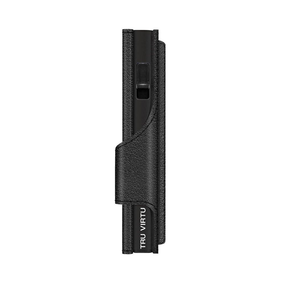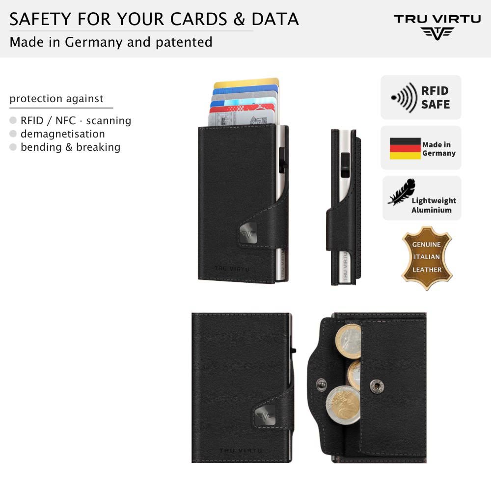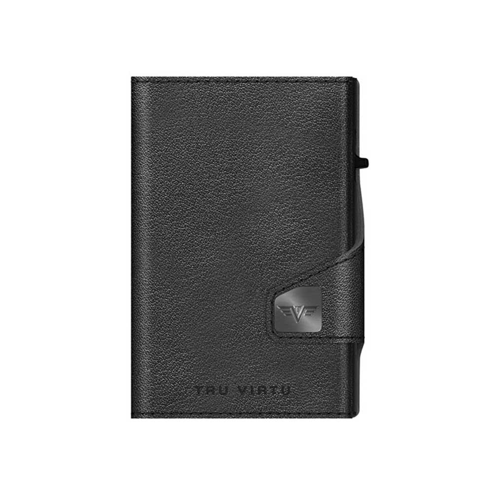 Vertical wallet made of Nappa leather in black colour with integrated special mechanical aluminum storage case with RFID system, as well as places for documents, banknotes and coins by Tru Virtu.