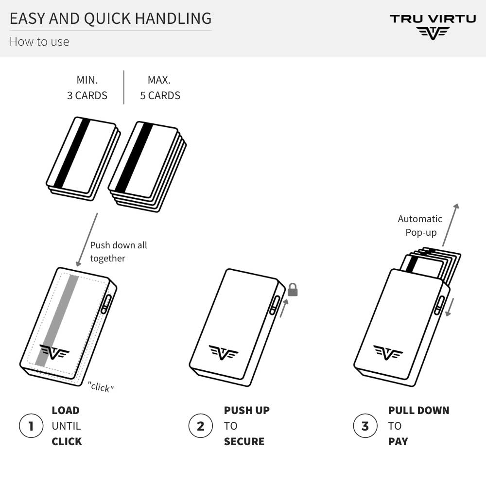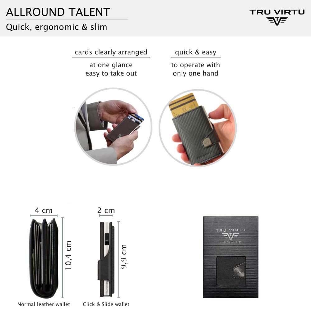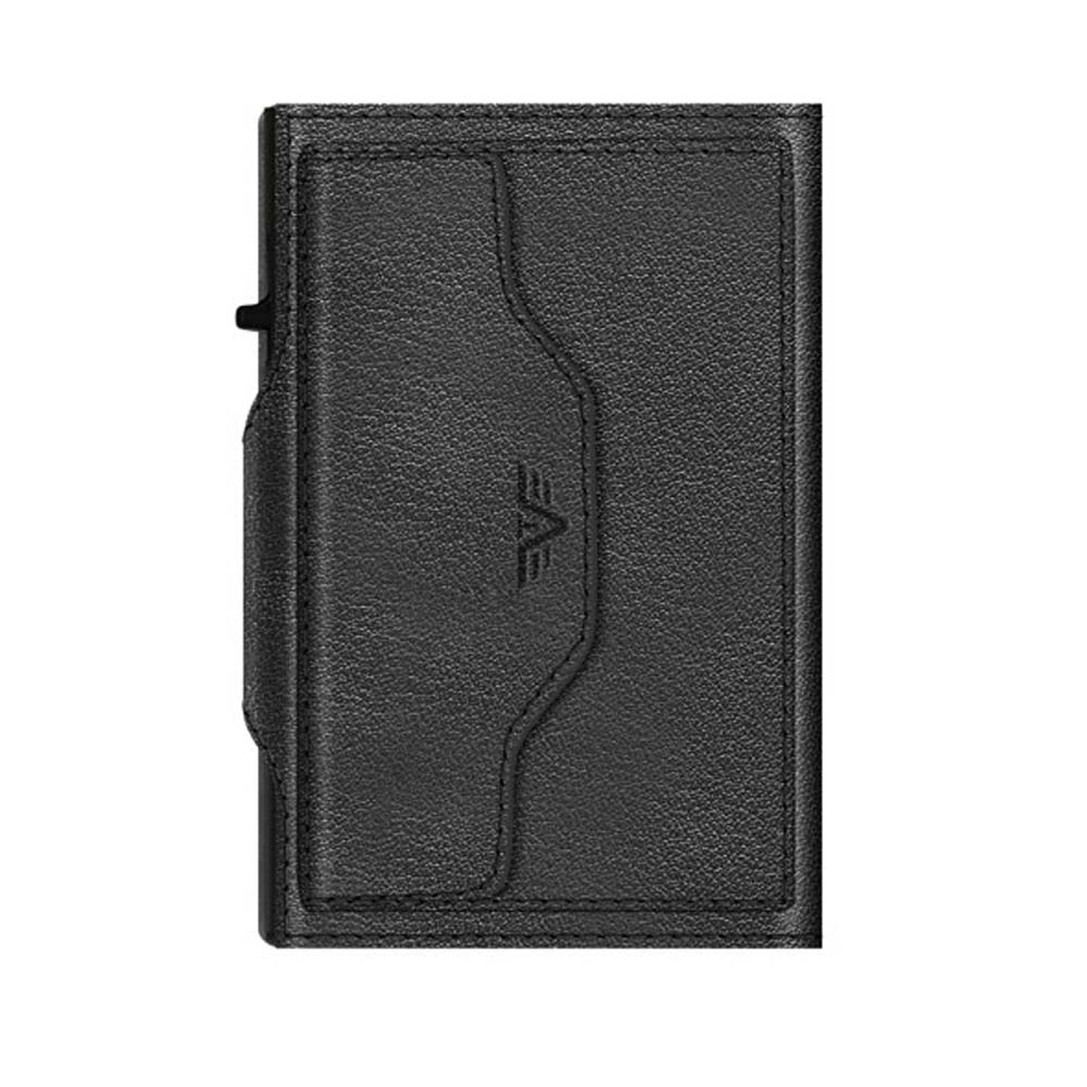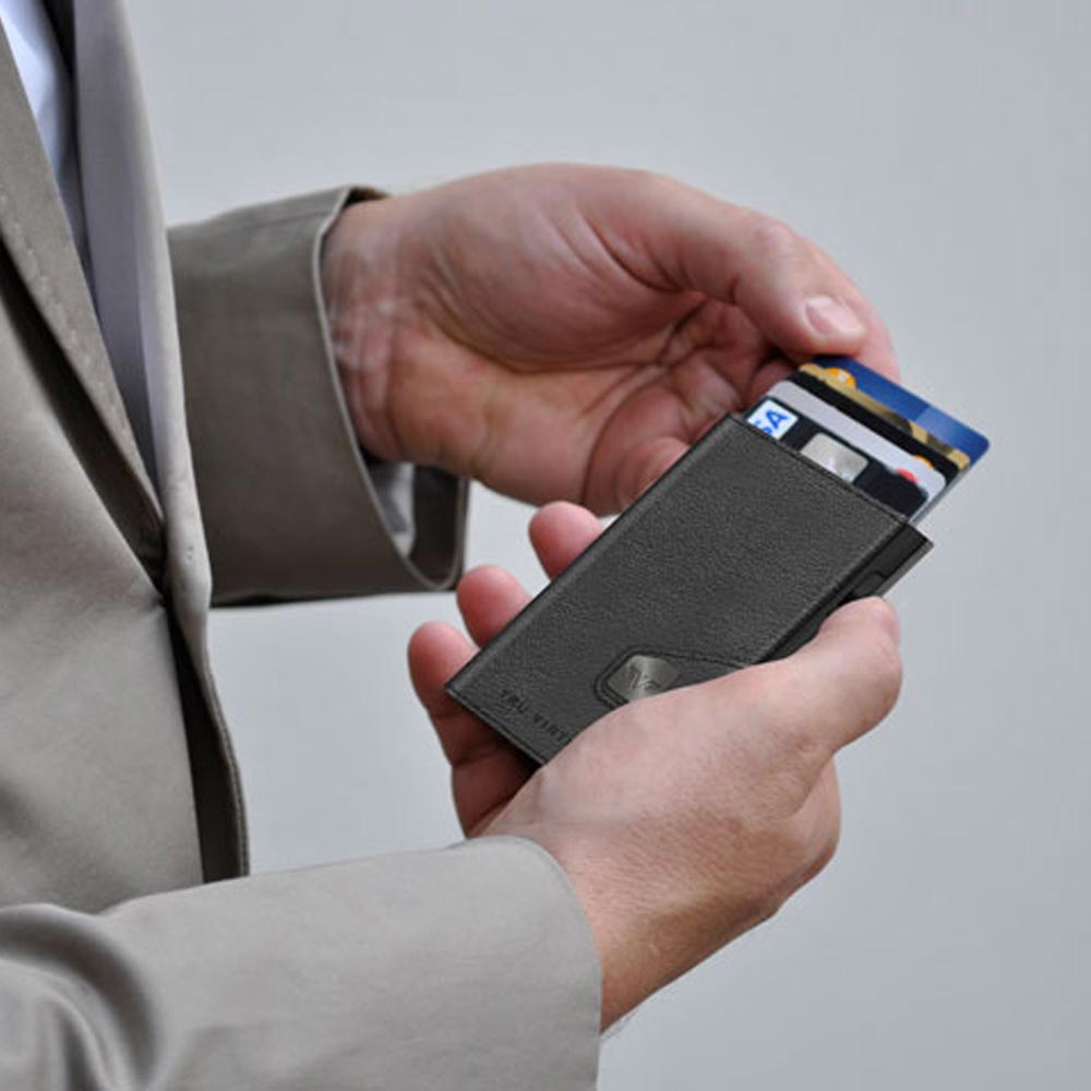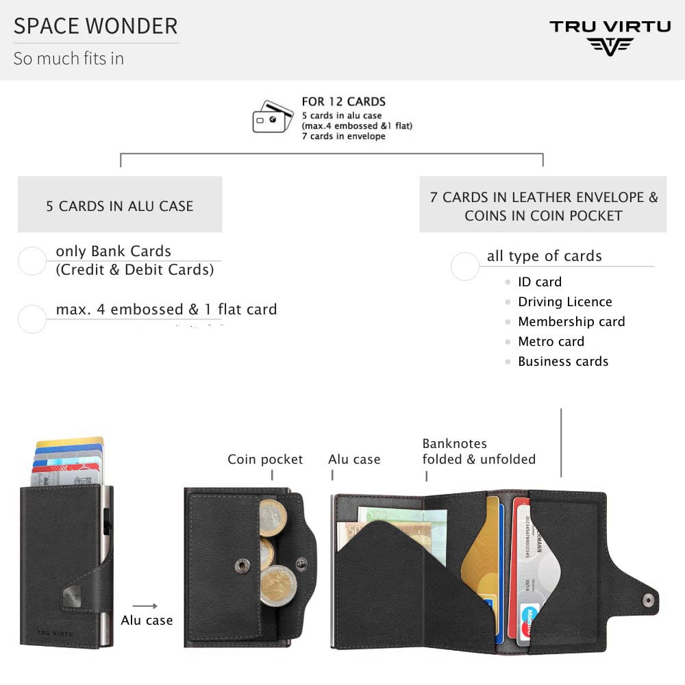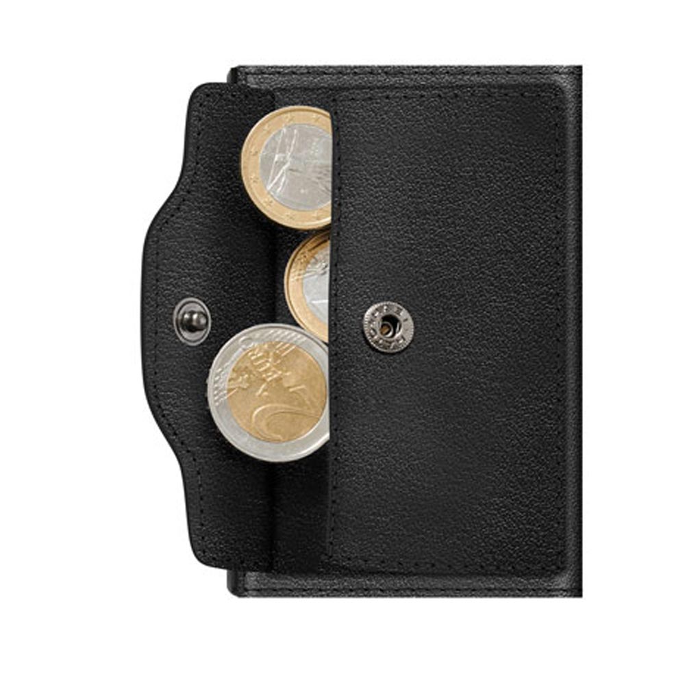 Vertical wallet made of Nappa leather in black colour with integrated special mechanical aluminum storage case with RFID system, as well as places for documents, banknotes and coins by Tru Virtu.