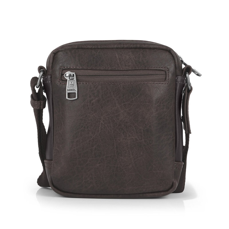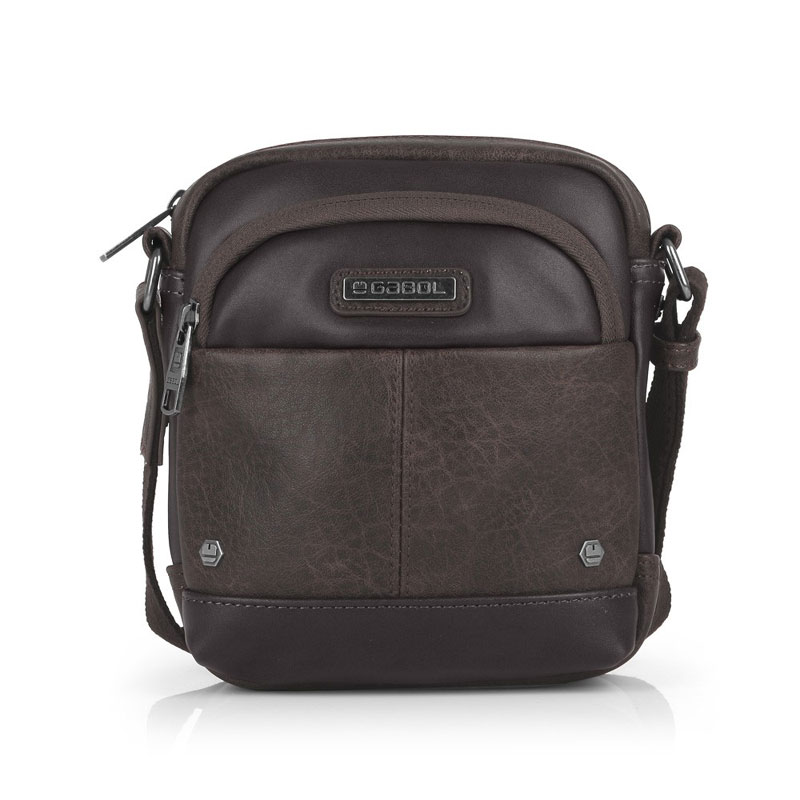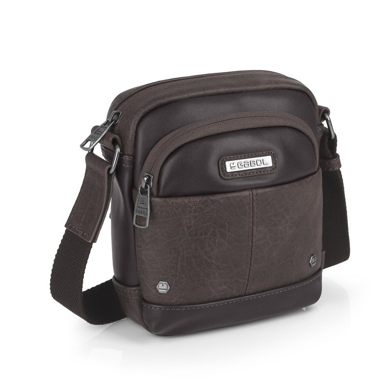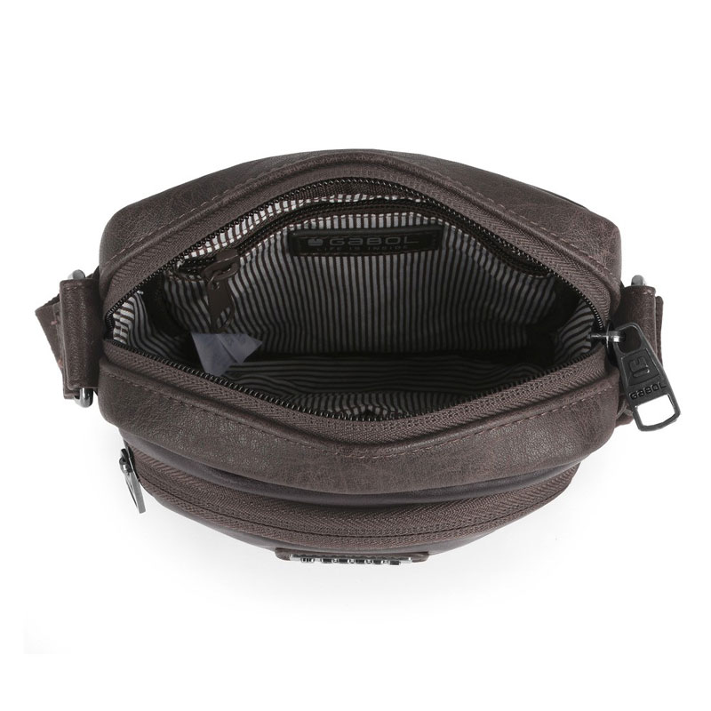 Τσαντάκι ώμου ανδρικό καφέ από συνθετικό υλικό PVC της Gabol, με μία κεντρική θέση, δύο θήκες εσωτερικές και δύο εξωτερικές με φερμουάρ.