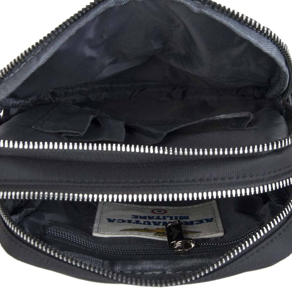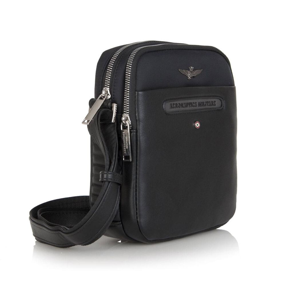 Τσαντάκι ώμου ανδρικό, αδιάβροχο, σε μαύρο χρώμα της Aeronautica Militare. Εξαιρετικά ελαφρύ και ευέλικτο, μπορεί να κρατηθεί όλες τις ώρες ακόμη και για επαγγελματική χρήση. Διαθέτει δύο κεντρικές θήκες, τέσσερεις εσωτερικές τσέπες και τρεις εξωτερικές.