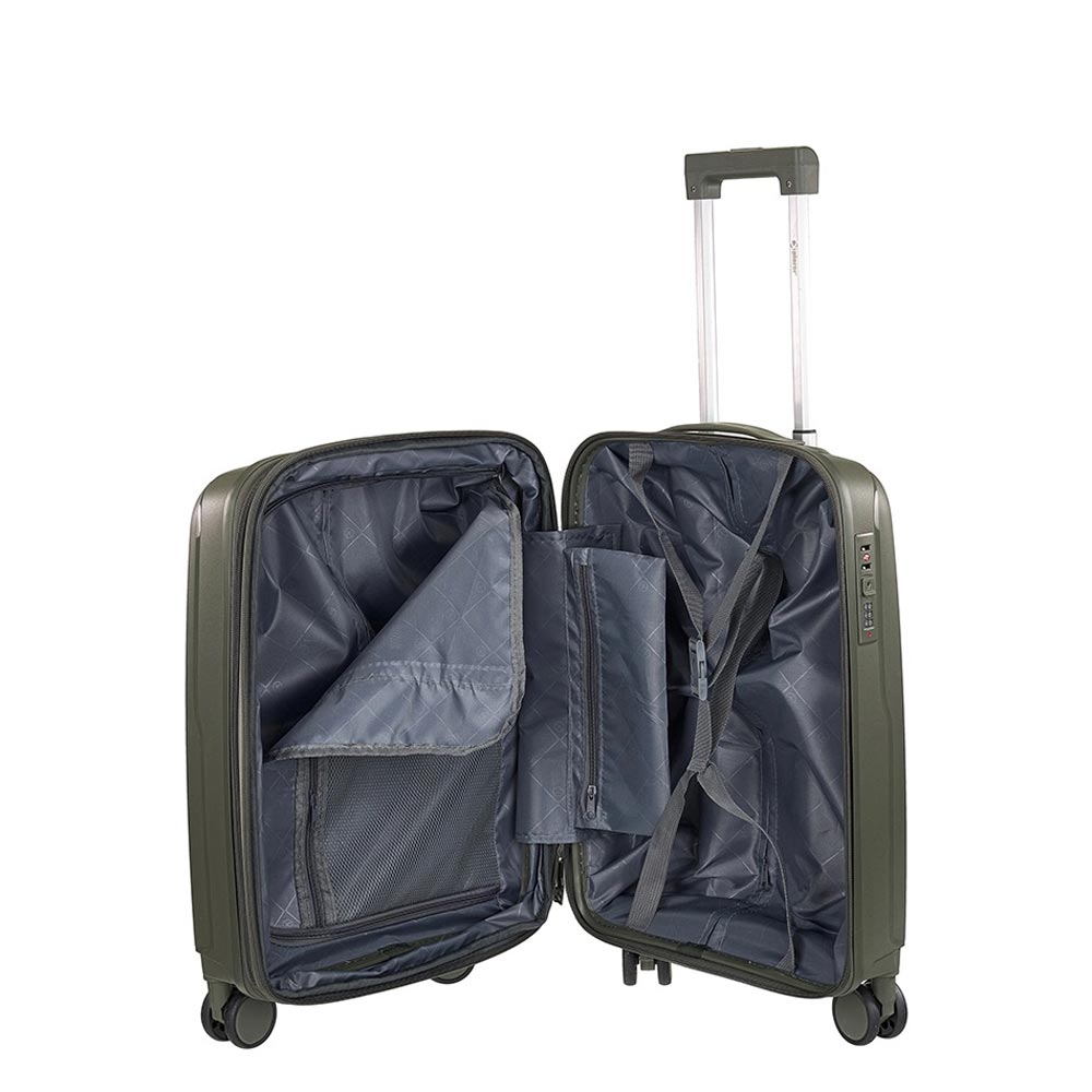 Βαλίτσα σκληρή, μικρή, επεκτάσιμη, καμπίνας σε λαδί χρώμα, με τέσσερις διπλές ρόδες της Xplorer. Είναι κατασκευασμένη από υλικό εξαιρετικής ποιότητας και αντοχής, μηχανισμό από αλουμίνιο, ρόδες ιδιαίτερα ευέλικτες. Κλειδώνει στην δεξιά πλευρά με κλειδαριά συνδυασμού με το σύστημα TSA και συνοδεύεται από εγγύηση αντιπροσωπείας δύο ετών.
