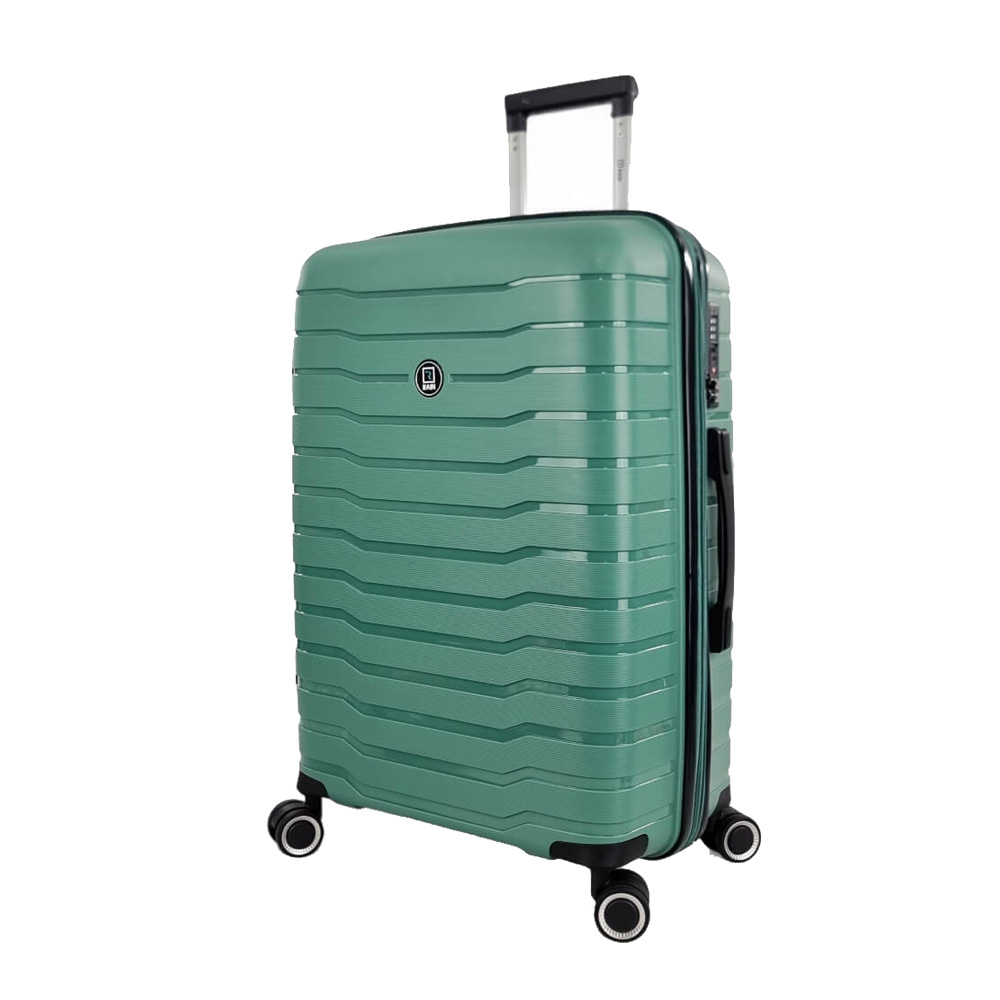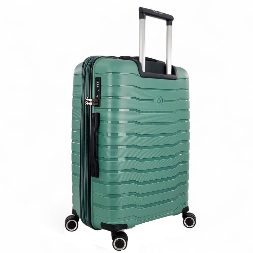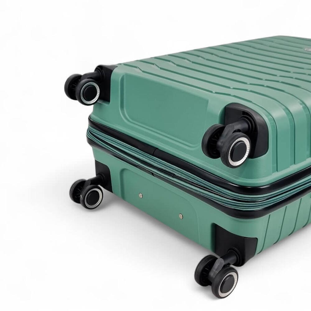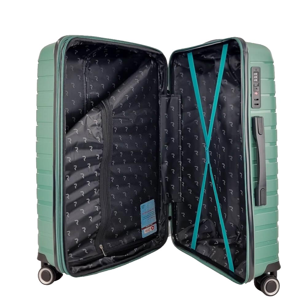 Βαλίτσα σκληρή, μεσαία, ελαφριά με τέσσερις διπλές ρόδες σε πράσινο χρώμα από την Rain. Εξαιρετικά κομψή και ευέλικτη, ιδανική για κάθε σας μετακίνηση. Ο κεντρικός της χώρος διαιρείται σε δύο μέρη. Κλείνει με φερμουάρ και κλειδώνει στο πλάι με κλειδαριά συνδυασμού που διαθέτει το σύστημα TSA.
