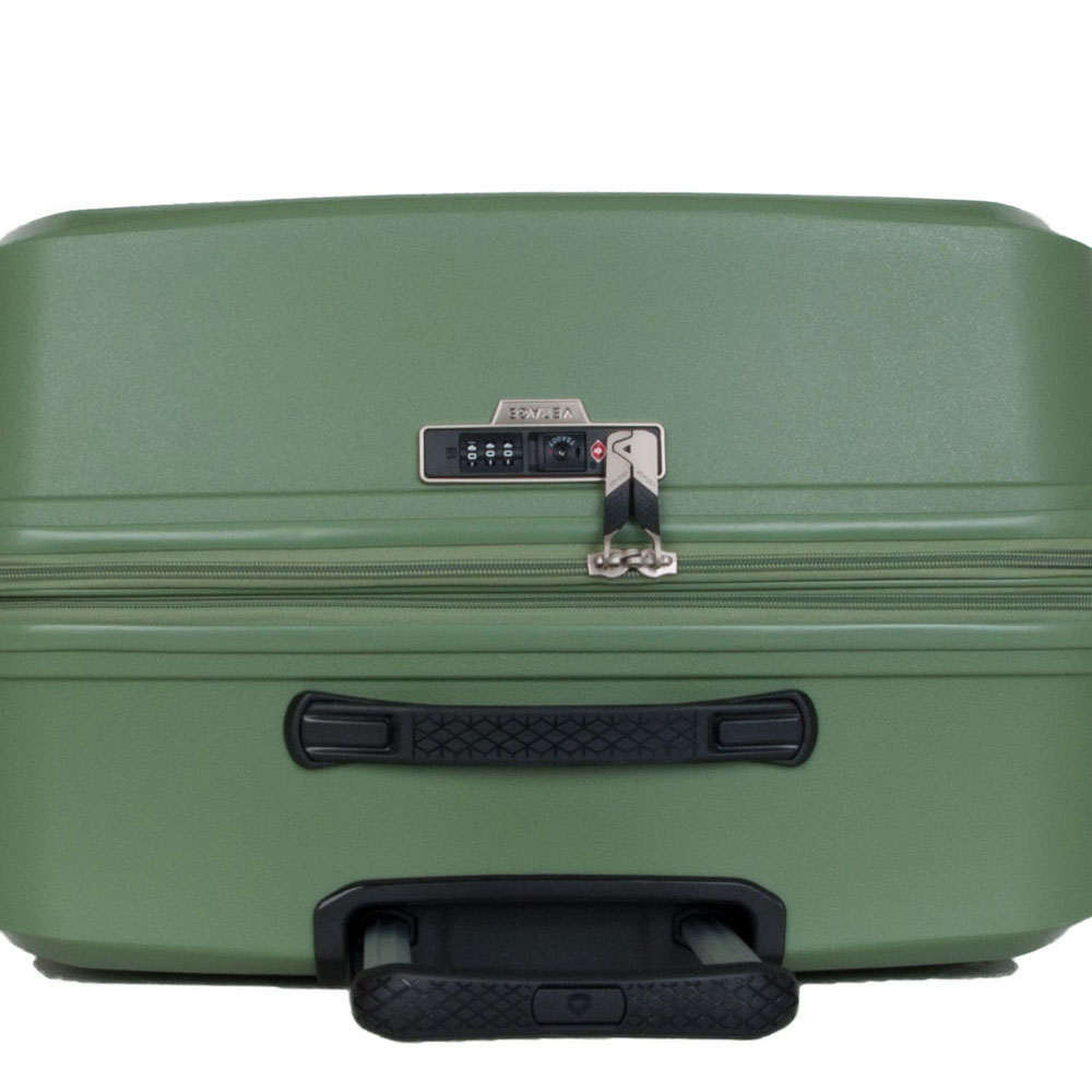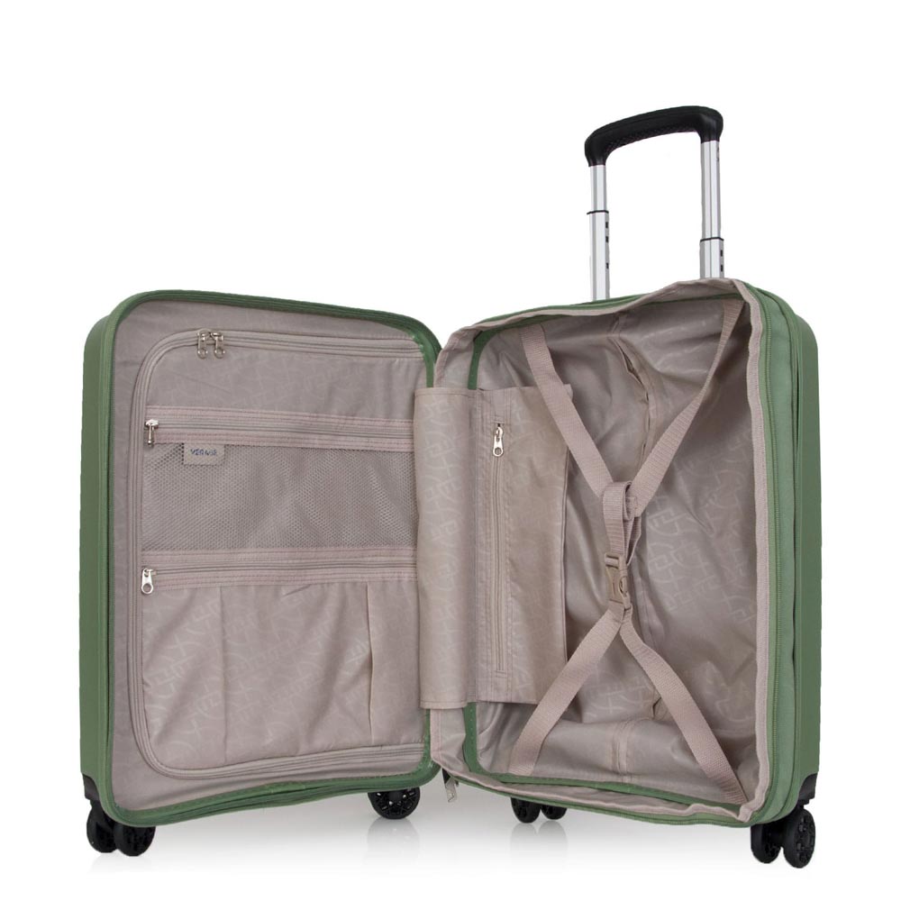 Βαλίτσα σκληρή, μικρή, επεκτάσιμη, σε πράσινο χρώμα, εξαιρετικά ανθεκτική από την Verage. Μία βαλίτσα ιδιαίτερα ευκίνητη που μπορεί να κρατηθεί οριζόντια ή κάθετα. Διαθέτει ένα κεντρικό χώρο που διαιρείται σε δύο επιμέρους, με τέσσερεις διπλές ρόδες και κλειδαριά συνδυασμού με το σύστημα TSA.