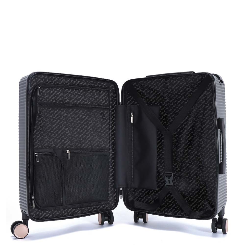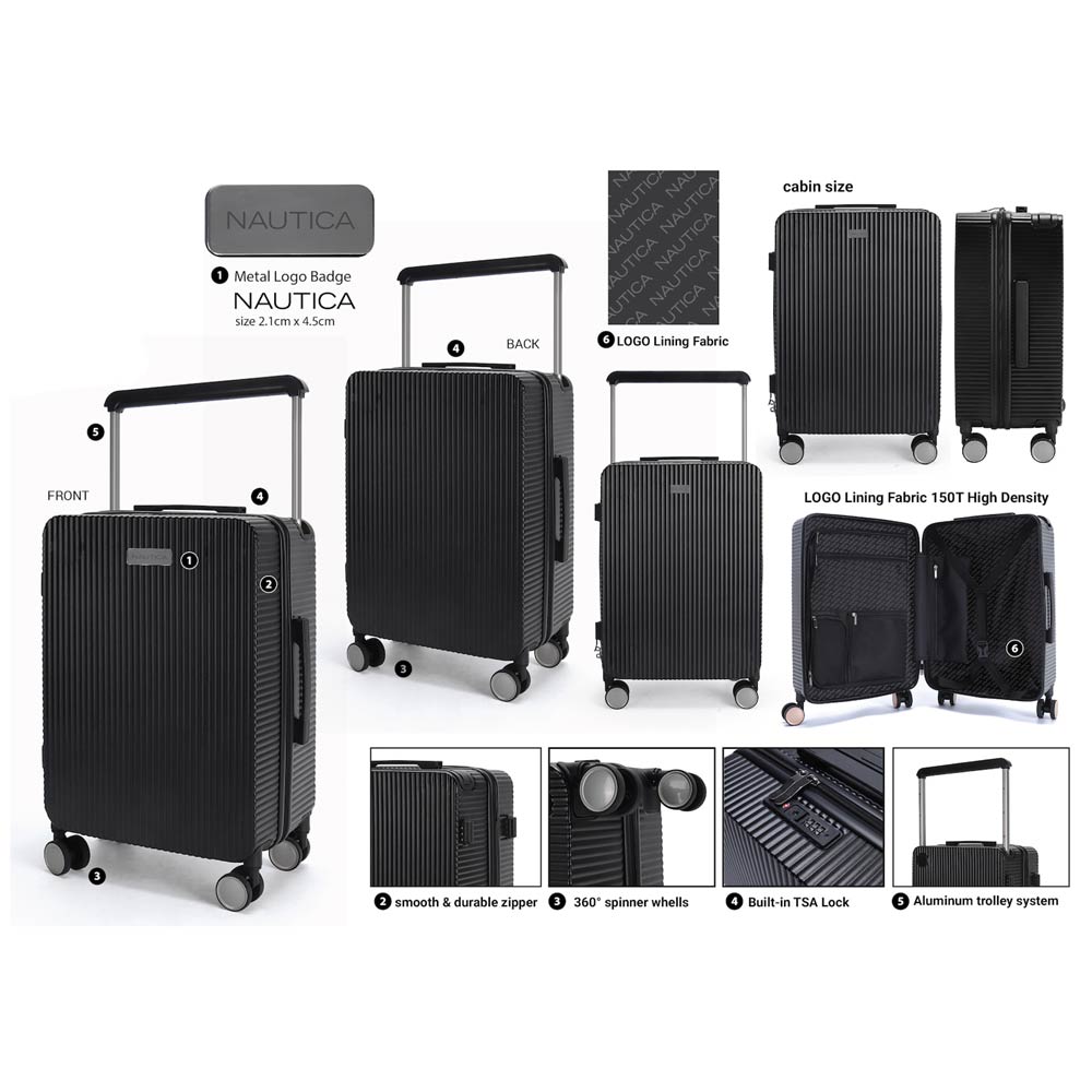 Βαλίτσα σκληρή μικρή, σε μαύρο χρώμα, εξαιρετικά ελαφριά, με τέσσερις ρόδες της Nautica. Κατασκευασμένη από ιδιαίτερα ανθεκτικό υλικό, με σκελετό από αλουμίνιο και κλειδαριά συνδυασμού TSA. Συνοδεύεται από εγγύηση αντιπροσωπείας 2 χρόνων.